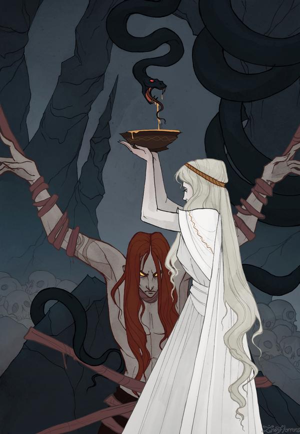 Loki, the trickster, the shapeshifter, is pleasing to gaze upon and questionable in character. They are cunning with-out a doubt, shifting gender on a whim, and often found to be in the direst of trouble, but it is their undeniable quick wit that allows them to save their neck. Blood-brother to Odin, child of giants, Loki is the father of monsters — Fenrir, the great wolf; Jörmungandr, the World Serpent; and, it is rumored, Hel, Goddess of Death — and mother to Sleipnir, the eight-legged stallion that is Odin’s steed. The stories say they will be bound in a cavern with poison ever dripping into their eyes because of the betrayals they’ve committed, and that they will side with the Titans at the end of the World. Yet while Loki gets themself into trouble frequently, and endangers the Æsir constantly, they are — for now — ever on the side of their tribe.